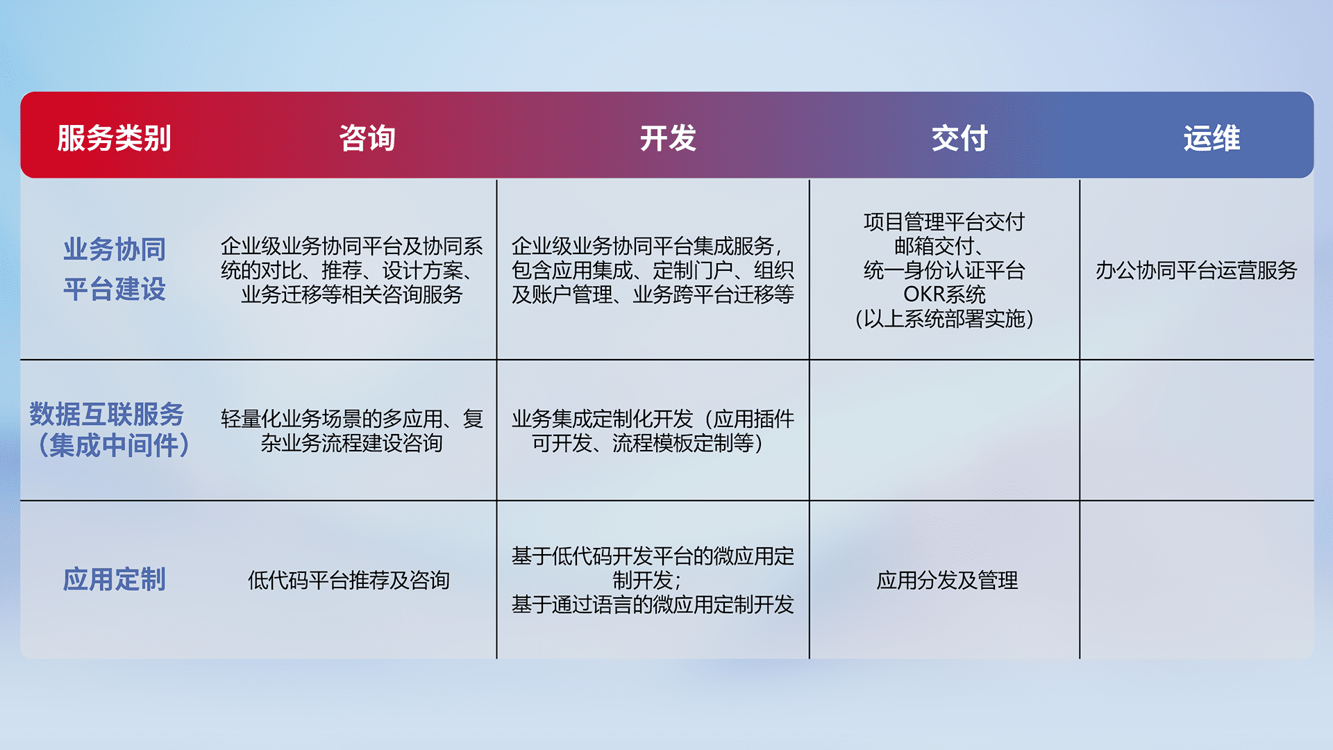针对钉钉、、企微、、、、IDaas等平台级产品提供产品的规划、、、、方案、、、、交付、、、定制化开发等服务,,实现如统一协同办公、、智能客户服务、、混合会议管理、、、智能数据查询、、、、等业务场景,,,,实现数字化转型。。